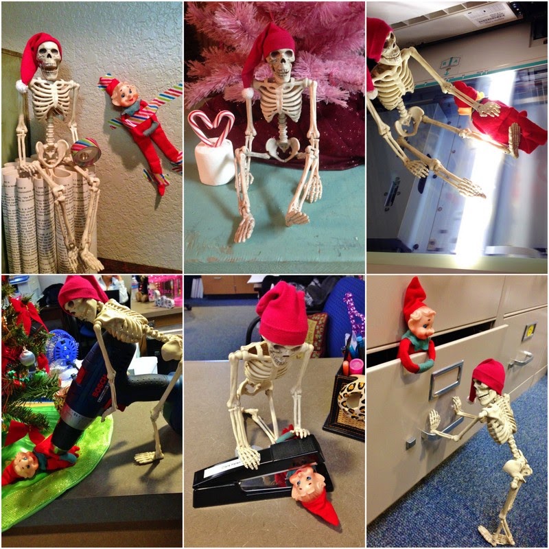 I think my orthopedists office staff would get a real kick out of these shenanigans. They had all his bony body part models out for Halloween and one of these little skeletons to greet you at the front door. Of course, when I broke my foot and he wanted to show me on the model they had to look all over the place for it. Your elf is very good-natured to play along with the skeleton!